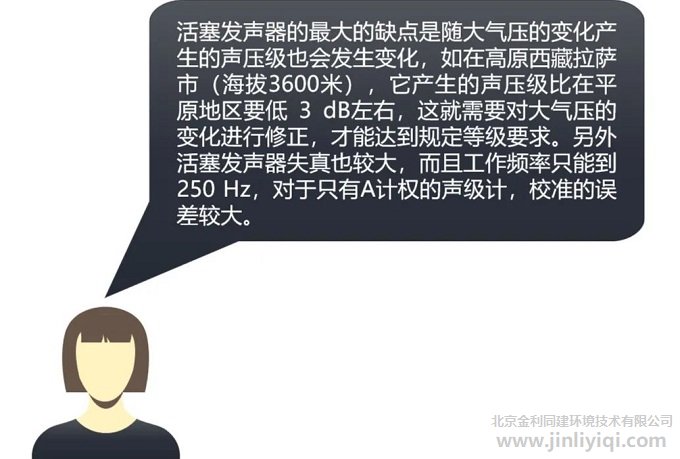 活塞發(fā)聲器的最大的缺點(diǎn)是隨大氣壓的變化產(chǎn)生的聲壓級也會發(fā)生變化,如在高原西藏拉薩市(海拔3600米),它產(chǎn)生的聲壓級比在平原地區(qū)要低 3 dB左右,這就需要對大氣壓的變化進(jìn)行修正,才能達(dá)到規(guī)定等級要求。另外活塞發(fā)聲器失真也較大,而且工作頻率只能到 250 Hz,對于只有A計權(quán)的聲級計,校準(zhǔn)的誤差較大。